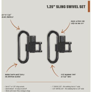 This Sling Swivel Set includes a pair of quick-detach swivels for fast attachment and removal. Offered in 1-inch and 1.25-inch sizes to match common sling webbing widths. Designed to work with most rifle and shotgun slings for a secure, dependable connection.
