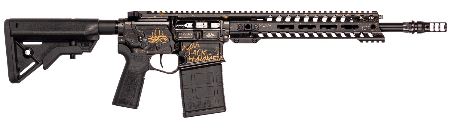 The special edition of the Rogue rifle is a limited production run based off of Bill Goldberg’s personal Rogue. The exclusive black and burnt bronze Cerakote artwork is done by CGC Cerakote. Project “Jack Hammer” was an exercise to turn the Revolution platform into the lightest .308 semi auto rifle on the market and to do it without needless “lightening” cuts. The Jack Hammer features a forged receiver set; Key-Lock BCG w/Roller Cam Pin; ambidextrous safety selector; multiple QD Sling attachment points; 11″ Renegade rail with our oversized Heat Sink barrel nut and topped off with a Pinned and Welded Dead Air KeyMo Muzzle Brake to meet the 16.10″ barrel length requirements. Includes COA autographed by Bill Goldberg himself.